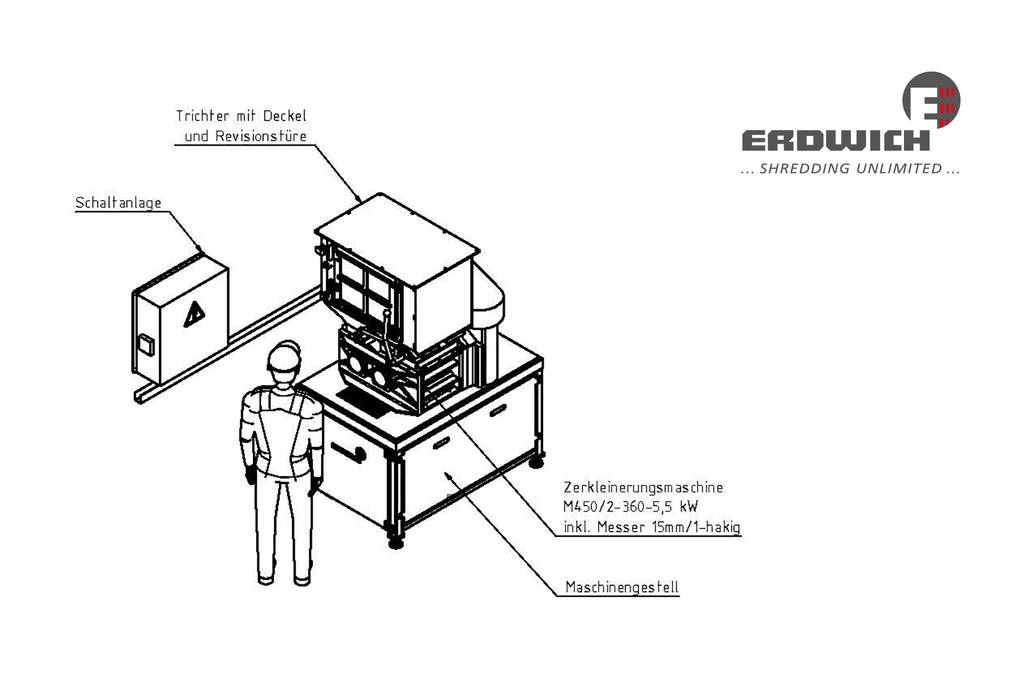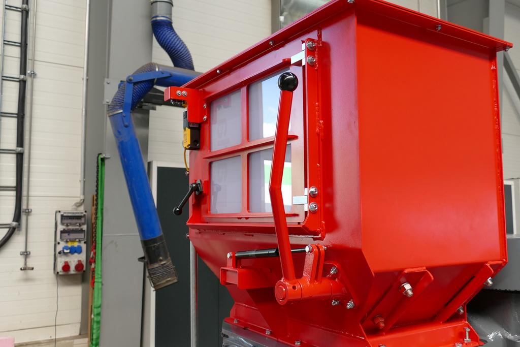 ¡Nuestra trituradora bieje M450/2-360 se adapta a estas condiciones extremas! Su diseño compacto y muy robusto reduce al mínimo los trabajos de servicio y mantenimiento y se puede integrar en la estación para ahorrar espacio. Todos los residuos, como basura doméstica, latas, envases de plástico, vidrio, cajas de cartón y botes, se trituran y procesan de forma fiable. El material se introduce manualmente. Si es necesario, la alimentación de material es respaldada por una prensa manual situada en la tolva. La extracción del material se realiza en caída libre en los contenedores situados en la parte inferior.