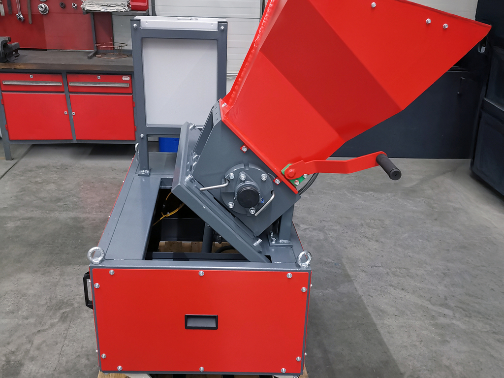 Das System kann in diesem Fall mittels einer handbetätigen Hydraulikpumpe inkl. einfach wirkendem, platzsparendem Hydraulikzylinder aufgepumpt werden und der verbaute Klapprahmen mit Zerkleinerer geneigt werden.